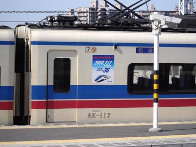 かねてから撮りたいと思っていた、京成電鉄のリバイバルカラー。 ようやく重い腰を上げ、とりあえず京成本線へ。 今回は、コンデジでの撮影分だけアップします。 日暮里から乗車してすぐ、町屋で”青電”とすれ違い、思案の末、 次の停車駅”千住大橋で下車。 上り線ホームから撮れそうだったので、上野からの折り返しを撮影。 金町行きだったので、とりあえず高砂へ。 下りを待つ間、スカイライナーの上野送り込み回送車が運転停車。 車体側面には・・・ 成田スカイアクセスのPRステッカー。 自分達を廃車に追い込む新型車のPRを貼られていることに、 もしAE車が意志を持っていたならば、どんな風に感じているのでしょう。 高砂に着くなり、金町を往復してきた”青電”が入線。 走りは千住大橋で撮ったので、ここでは駅撮りだけで、次の目的地へ。 事前の情報収集で、この金町線、千葉線・千原線での運用が多いらしいので、 ここは一旦、津田沼へ。 津田沼に着いた目の前には、”赤電”が! まともに準備するまもなく、発車べル!! やっと撮れたのがコレ↓ 。 多少トリミングしてありますが、ちょっと不満。 ということで、この列車の折り返しを狙うべく、次の列車で追っかけ。 千葉・千原線は全くの初めて。 ロケハンをしつつ、折り返し時間を考えていると、ありました! 幕張本郷付近で待つことにしました。 並走するJRがひっきりなしにやって来るのですが、金網に阻まれ 撮れる状態ではありません。 253系もまだまだ元気なようです。(油断は出来ませんが) のんびりと待ちながら、新京成を撮りつつ、”赤電”を待ちます。 そして、一時間程待ち、”赤電”が上って行き、その返しも撮って、 とりあえず、ここでの撮影は終了! JR幕張本郷の駅は、幕張電車区の真横。 ホームから113系を撮って時間を潰しました。 こんなに沢山の”スカ色”を見たのって、随分久し振りです。 こんな光景をいつまで見られるのでしょうか。